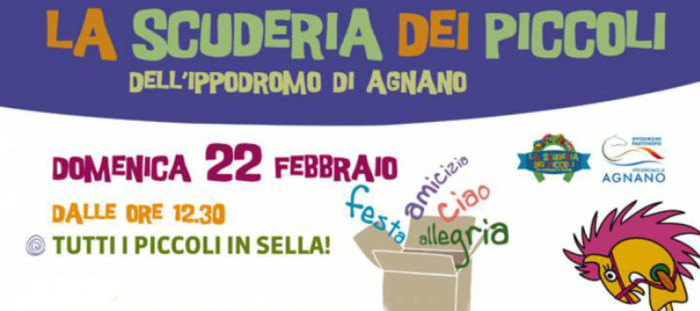 Domenica 22 febbraio all’Ippodromo di Agnano (ingresso gratuito al parco dalle ore 12) la Scuderia dei Piccoli (ore 12.30/16.00) aspetta tutti i bimbi per un giretto in sella ai pony (alle 12.30).